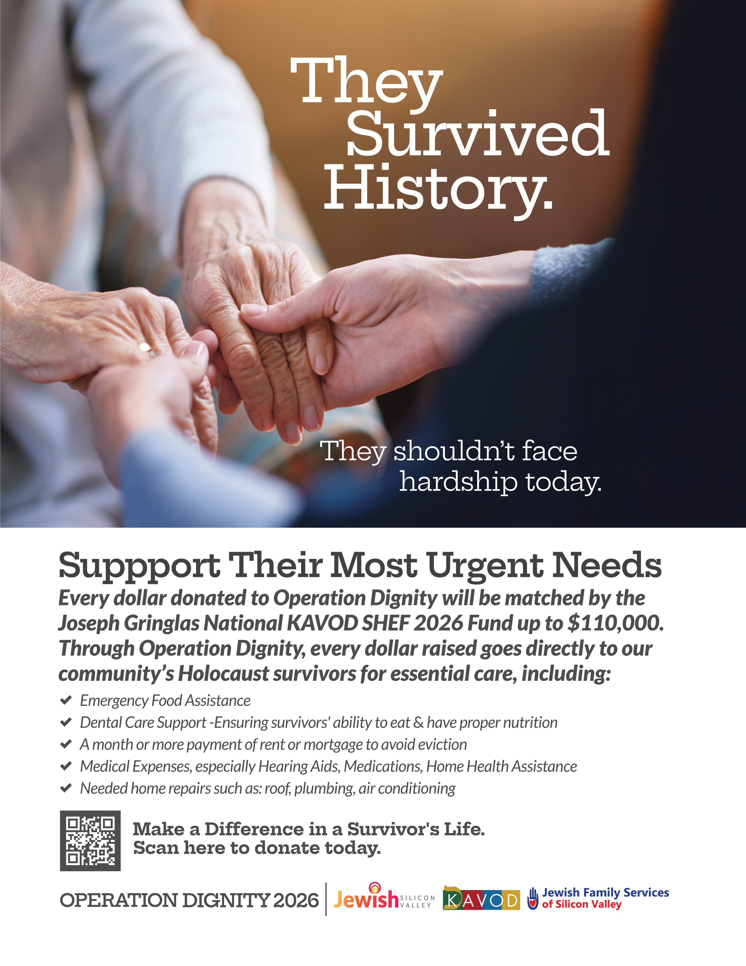 Additionally, we are pleased to partner with Jewish Silicon Valley to raise funds to support Holocaust survivors. Operation Dignity is our 2026 fundraiser to raise $110,000, which will be matched dollar-for-dollar by the Joseph Gringlas KAVOD SHEF National Fund for a total of $220,00 to pay for emergency expenses for survivors, including dental, medical, hearing aids, essential home items, and unexpected expenses.